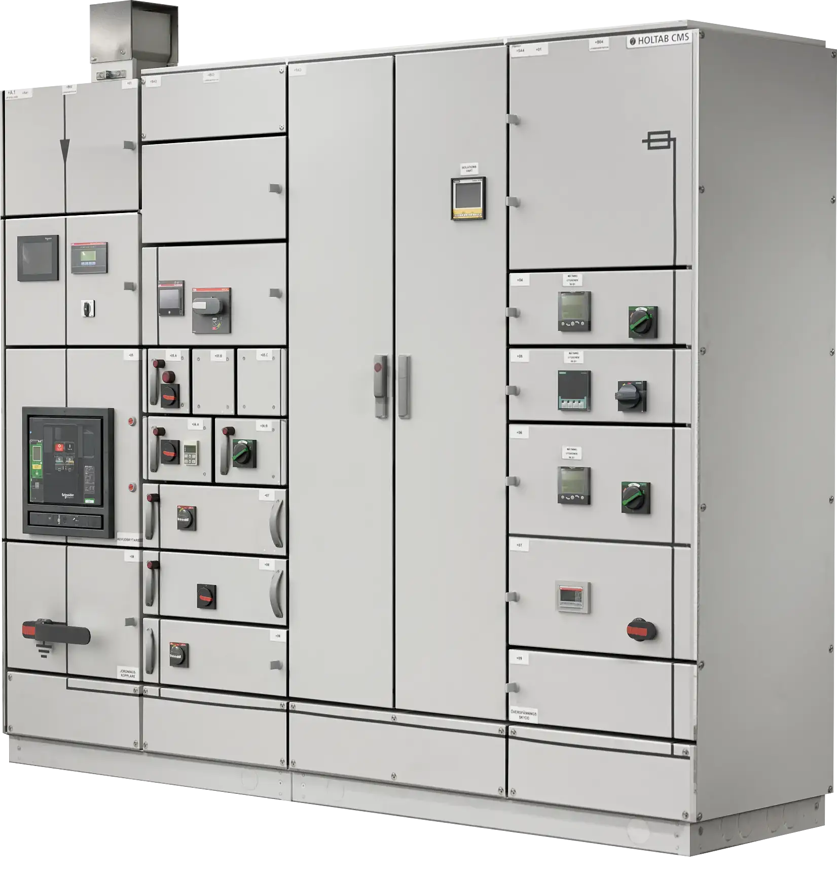 Holtabs CMS-ställverk passar exempelvis bra för stora offentliga byggnader och tunga industrier. Det är ett gediget system som står emot fukt och smuts. CMS är moduluppbyggt och ger full flexibilitet vid val av dimensioner, har möjlighet till högre märkdata och mer avancerat tekniskt innehåll.